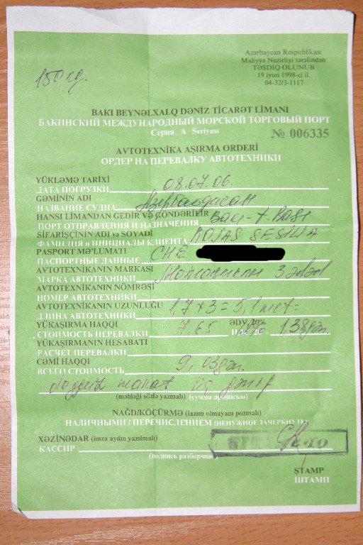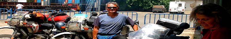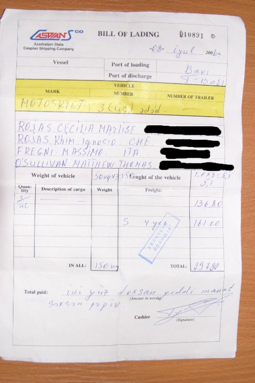 ![]() Now for Azerbaijan. At the control point, we stopped behind the cars and waited. Waited some more. They were letting in a car every 10 minutes or so! Of course, someone in a turbo Mercedes would just drive by and cut in, shutting off traffic until they let him in. As we were sitting there watching the show, a money changer came by and we changed our remaining Georgian Lari to the Azerbaijani Manat, for our 23 lari we got 50,000 manat! He also said to just drive to the front of the gate, and started directing traffic around us so that we could get out and move to the gate. He then proceeded to talk to the military guards at the gate, and presently one came over and asked for our passports. With these in had, he took off and presently came back and and waved us inside. Great, we were now at customs, and as usual this is where the problems always start. Maybe we should be doing this with a bicycle? To make a long story short, ok, shorter. It took 2.5 hours in total to get out of Georgia and into Azerbaijan. The majority of time, 2 hours was spent at customs in Azerbaijan. Cecilia was shuffled back and forth, and there was a lot of problems with the language. In the end the result was we got into the country with our 15 day visa, no problem. The motorcycles, were only awarded a 3 day transit visa. So the end result is that we have to be out on the 8th of July! The problem is that as a tourist, with your own transportation, customs requires a deposit of 10,000$ per bike, and unfortunately after counting our loose change we just couldn't come up with it. Well, actually it is even more complicated. You can only leave the deposit if you come back out the same way, otherwise you probably won't be allowed to leave, and loose your deposit? As we weren't coming back this way, this was out for us, and we would not have left such a deposit anyway! Leaving the only alternative, a transit visa for three days. For the overview, check out Formalities: Azerbaijan So now we were in Azerbaijan! This makes the 14th country so far this trip. First thing we noticed, it is relative prosperous, and there is much more "color" than in Georgia. This is something, which we later realized is due to the fact that in Georgia, there was nearly no advertisement. As soon as you hit Azerbaijan, there are billboards and signs for all the usual stuff. This had been missing in Georgia, so you only saw the drab buildings, which Azerbaijan also has, but they at least have some "promotional" color! Additionally the roads are much better, and there is a lot of building and construction going on. So next to the economic basket case which is Georgia, Azerbaijan stands out as a progressive and prosperous country. The people are incredible, again. I am starting to run our of adjectives to describe all the interest and friendliness that all the people show us as we travel around. The Azerbaijani's nearly run us over to talk to us at traffic lights or on the road. Very dangerous, but incredible curious and friendly. The road towards Baku, goes straight through the center of the country, which is totally flat, flanked by mountain ranges right and left. This is the bread basket of the country, pretty boring, but at least we were making headway. Only when we go into towns, or away from the main roads, are you reminded of the roads in Georgia. If anything in places it is worse here, as they are re-routing some of the main roads while working on them, and you are forced to go through some very adventurous ground. (Have I mentioned lately, that it was still raining!). After a few hours in Azerbaijan, we finally hit some dry weather. The rain stopped, and we could see clear weather in the distance. Great, finally. We rode as far as we could, and shortly before it got dark, we got lucky and found a hotel. Lucky, while we were actually on the wrong road. This one also heads to Baku, but is slower than the main road, and has less traffic, so why there was a hotel here was not quite clear. Nevertheless, there was one, and I negotiated a price of 20manat (new manat = 100,000 old manat). And we moved into a nice large room in an old barrack building, which had been converted to a hotel. Perfectly passable. We spread all our stuff around to try and dry some of it, making a huge mess in the process. The following day we headed to Baku, now only a 150km away. Baku, turned out to be a busy metropolis, with all the usual amenities, and noise, traffic and confusion. We are starting to be really adverse to going into cities. Something which we always have dreaded. We rode around, trying to make sense of the maps which we had, the most detailed being the city map in the Lonely Planet, Georgia, Armenia & Azerbaijan. A book, you should avoid like the plague. We have been and continue to be big fans of the series, but this one is horrible. The data is worse than useless and just plain badly written and researched. As we were trying to find a hotel, a cab driver stopped and asked us if he could help. We explained, and in short order he offered to show us to the hotel, which he then did, for no remuneration. Great. The hotel didn't turn out to be what we had wanted to we headed to another one but, the gesture was wonderful. In the end we settled for a relative expensive but well located hotel near the port, which had great parking for the bikes. This is something which I probably have mentioned before, but I am going to do it again. Whenever we stay in a hotel, I am very, very reluctant to stay anywhere, where the bikes have to be parked on the street. Only on a couple of occasions have I done this, and I try to avoid it. This means that the hotels which we stay in have to accommodate this, and those that can are usually a bit dearer than your run of the mill flop house. Which, would suit us fine, but not my bikes. We got to the ferry terminal bright and early (ok, 8:00), and were told that it would be open at 8:30. As we were sitting there waiting, anothe