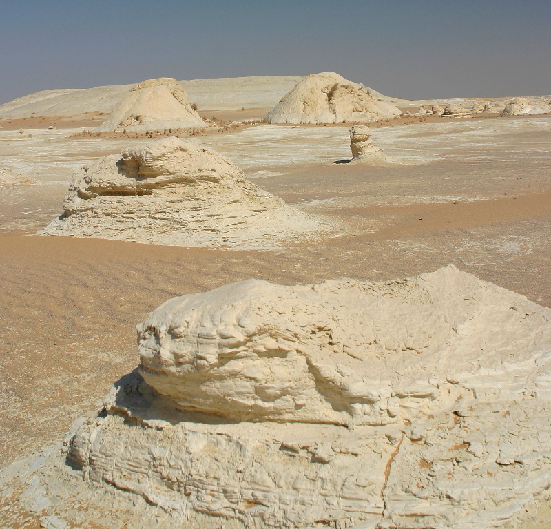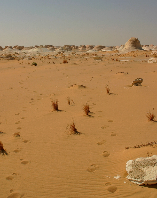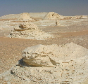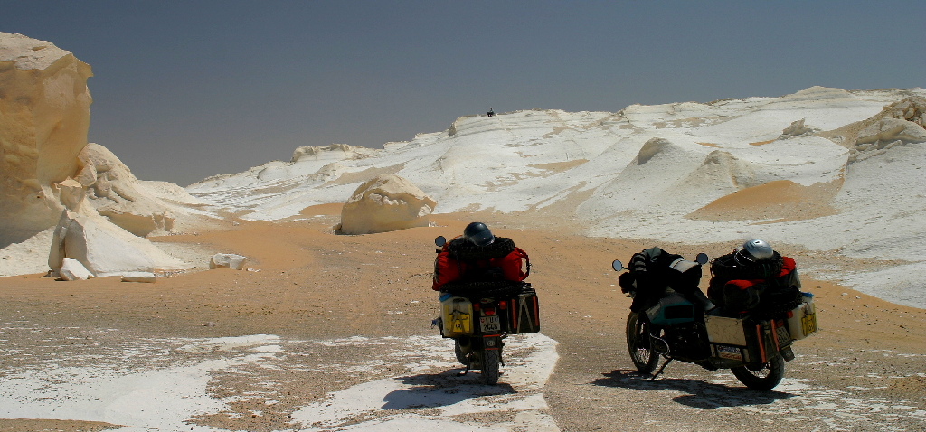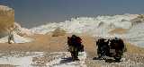 When we got to the "White" desert, we decided to try and drive in a bit to have a look. In some places it was pretty bad, with very deep, powder sand, but we stayed near the hard rocks and made it a couple of kilometers in. At a nice bluff we hiked up to have a look around and decided that we were going to spend the night here and enjoy some wild camping. It turned out to be a fantastic spot, with a nice view of the whole area. We left the bikes there and spent 3 hours hiking around the various rock formations. Incredible what the wind can do. The whole area seems to be made out of limestone and the softer rock has just been eroded away leaving some fantastic shapes standing. And, everything is white, snow white. On film it is indistinguishable from snow! Check out more pictures under Pictures: Egypt.