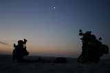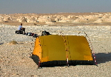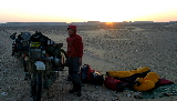 | When we returned we made a nice cup of tea and watched the sunset. Beautiful. From where we were, we could see large numbers of 4x4 drive by, and further into the park. One group of two 4x4 pulled up around 1km from where we were and started setting up a kitchen! They spent an hour getting everything ready, and then a larger group of 4-6 jeeps showed up, and the whole group sat down and had dinner under the desert night sky. After which everyone packed up and left. We were completely alone, not another person anywhere in sight. We had put up the inner tent when we went to bed it was nice and quiet, unfortunately around 02:00 in the morning the wind picked up and we found out that with only the inner tent up it tends to make a very annoying noise, when the wind blows. It seems that the strings holding the inner tent up start vibrating and make a very high pitched whining noise. So we took the tent down and sleep under the stars. Very nice. |