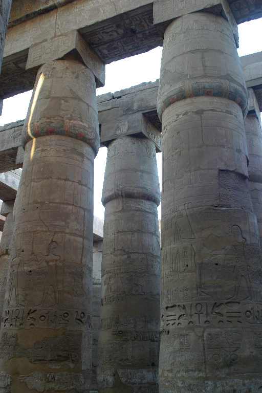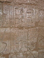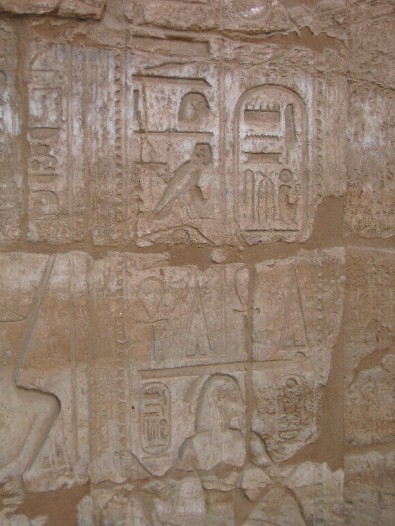 The following day we visited the Karnak temple just north of the campground (which lies between the two major sights here). We decided to go very early in the morning to see if we could avoid some of the crowds. We were at the gate at 05:55, 5 minutes before it opened and there were already two large buses of Japanese tourists. We couldn't believe it. We also couldn't believe the scale of this thing. It was huge, as in "extremely large". The whole Luxor temple complex could fit in a corner and pretty much get lost. This meant that the tourist didn't really bother us, we walked a bit in and were alone. They were pretty much all gone 40 minutes later anyway! This size of this thing didn't really do it for me (Americanism for "I didn't really like it"), in the end I found the Luxor complex much more interesting than this one. Nevertheless, here I found some excellent examples of the colors that they had used to decorate their temples, as it was still visible in some places. Nearly everything we had seen to date was plain sandstone so seeing some color gave us a whole different dimension to the way the ancients decorated their monuments. My favorite items here are the hieroglyphics which had been edited by subsequent generations. They basically edited the history written on the monuments, by re-engraving them (see picture below) pretty cool.