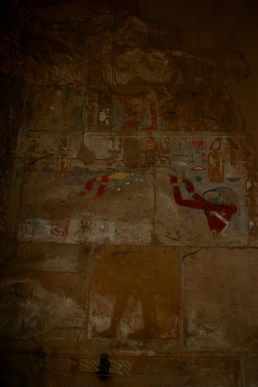 The next day, we headed for the valley of the Kings to see a couple of the tombs. Again, a very busy place. We visited three tombs (Ramses I, Tutmosis III, and Tawusret & Sethnakt, a double tomb). Ramses was nice as the entry was very short, the tomb itself has plenty of colorful wall paintings. The second was the oldest tomb here, and you could see that the style of painting was completely different than what we usually associate with the Egyptian dynasties. In this case there were more than 700 stick figure drawings of gods, and demigods, decorating the ante-chamber (the tomb was in two layers). The last was great as it had a couple of very large rooms, and again every square inch was covered with reliefs in various state of decay, in the first chamber there is a huge very colorful relief of a bird figure which I particularly liked.