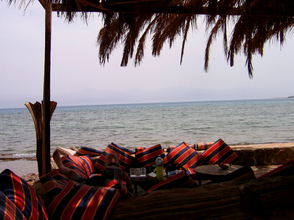We then headed to Nuweiba where there is a ferry terminal for boats going to Aqaba, our next destination. Since the bombing recently in Dahab, just south of here, Nuweiba was totally deserted. There were practically no tourists. We headed for a camp recommended by our friend Mr. Said back in Cairo. The Petra camp. This turned out to be a little slice of heaven, mostly because it was deserted, and the price (negotiated) was very good. We ended up staying an extra day, and since ferries ran everyday, it wasn't a big deal.