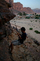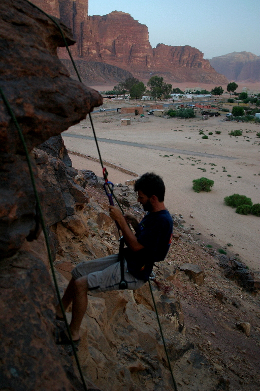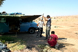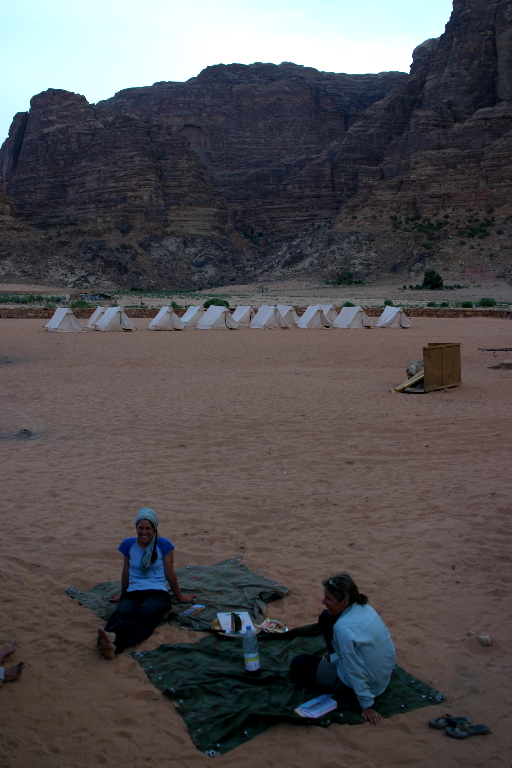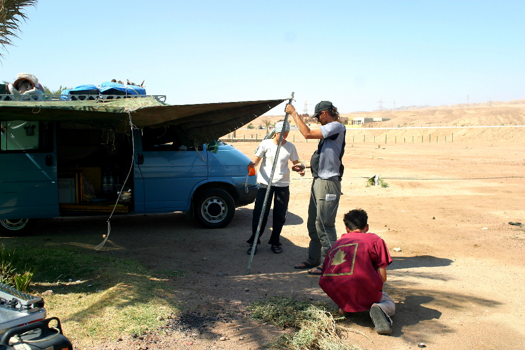 The visitor center is right in front of the "Seven Pillars" named after the book of the same name by T.E. Lawrence (Lawrence of Arabia) and has an outstanding view over the whole area. The visitor center also has a nice restaurant and an informative display of geological and cultural information of the area. Eventually Manuela and Francesco showed up in their WV bus and we headed into the park (after paying the obligatory 2JD entrance fee). One is only allowed to drive to the end of the paved road in Wadi Rum, after that one has to arrange for a guide preferably from the visitor center, as they manage the booking for the guided tours in the area. In Wadi Rum we setup camp at the Wadi Rum Rest House which is just at the entrance to the town. Here there is a restaurant, and tent accommodation available. We pitched our own tent and our friends parked next to us at one end of the compound right below some wonderful climbing rocks.