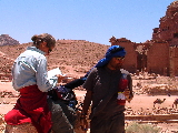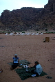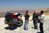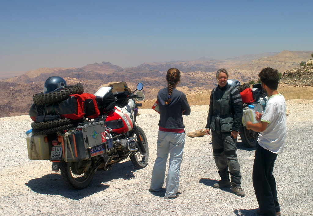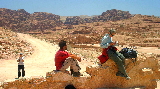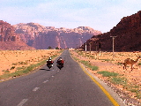 We left Wadi Rum two days later after a day of rest and relaxation as well as taking care of some practical matters, and headed to Petra a short (100km) distance away. Once back on the main road to Amman, the road climbed very steeply and after the turn-off to the "Kings Highway" it ran along a high plateau, with excellent views towards the plains and Israel in the distance. At one view point, we stopped and waited for Francesco and Manuela to catch up. As soon as we stopped, we were besieged by American tourists, wanting to know everything about us. I haven't had to speak this much English in a long time. They were very impressed with Cecilia riding her own bike! In short order Francesco and Manuela showed up and we continued to Petra. After spending a couple of hours looking for appropriate accommodations we settled for a "Bedouin" camp in the direction of Little Petra, just outside of Petra. There are two such camps here and one was twice as expensive as the other, so we of course chose the cheaper variation. Francesco then spent nearly and hour haggling with the guard and in the end negotiated a further discount of 1JD per person (2 Sfr.), in the end it was still pretty expensive though.