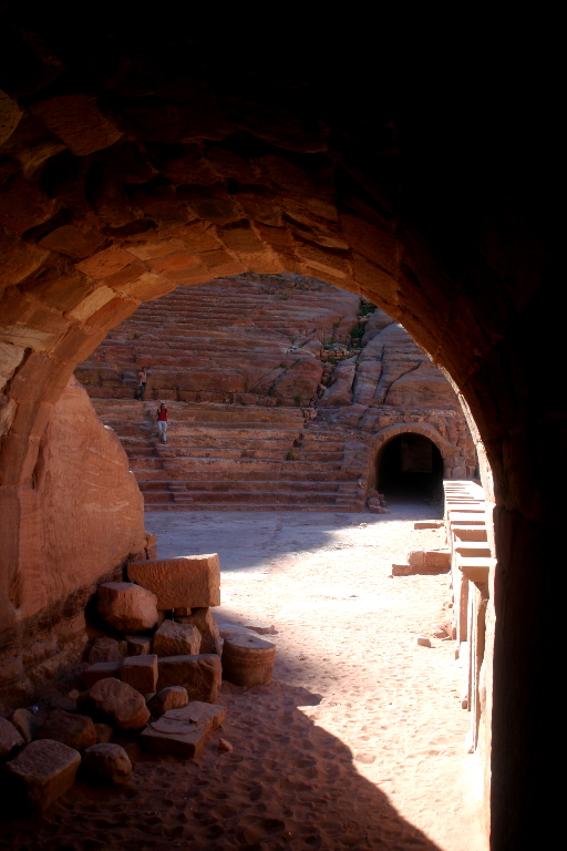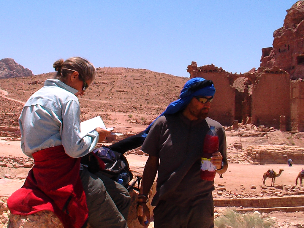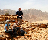 Before coming back out on the right side of the Coliseum we stopped and did some "archeological" digging of our own; in the garbage heap. Apparently here for eons the inhabitants (30,000) dumped their garbage and as long as you don't bring a shovel, they don't mind you scavenging around for pot shards and other garbage of various civilizations (Nabetean, Byzantine, and Roman). We did find a couple of interesting looking pot shards with patterns painted on them, probably only 100 years old if that, but hey, lots of fun anyway. We then sat in the Coliseum and were very impressed with the acoustics, I stood on center stage and did my best stand up comedy (quietly), they still heard me in the back and just shook their heads! So much for show biz.
