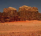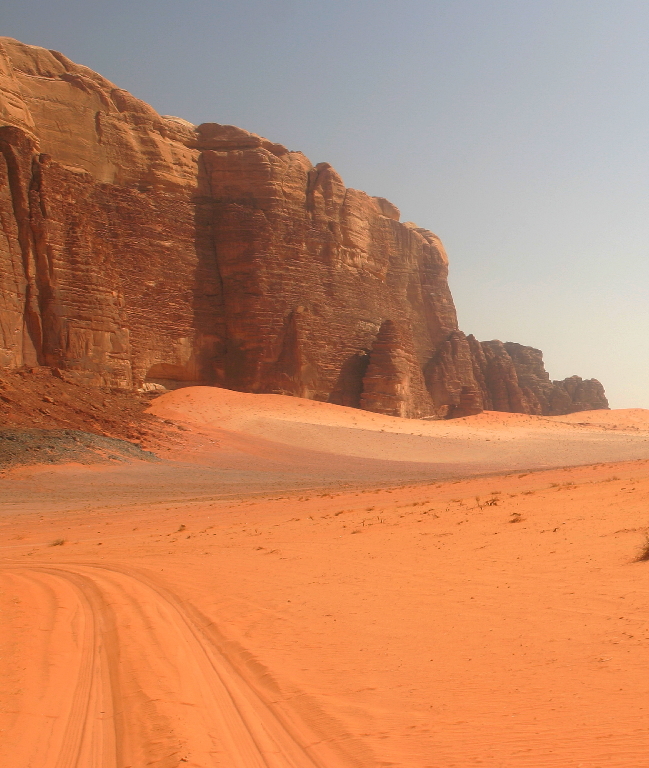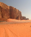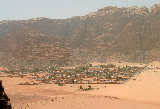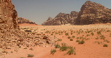 From Aqaba the road runs into the hills and follows a ravine until it climbs out onto a plateau. A few kilometers out of town we went through customs (Aqaba is a special economic zone). As we had nothing to declare, we just drove through. A half hour later or so the highway split off towards Wadi Rum, and nearly as soon as we turned off the landscape changed and provided spectacular vistas and colors. This wonderful, almost extraterrestrial landscape was the setting for part of "Mission to Mars", not to mention "Lawrence of Arabia" (the movies).