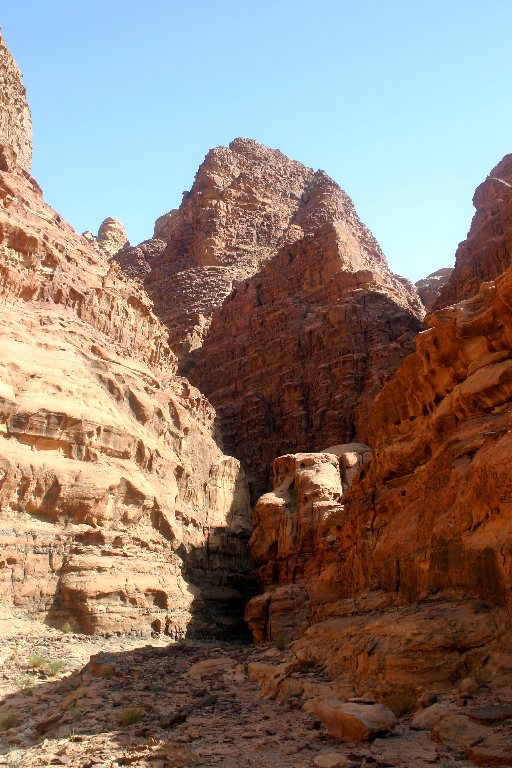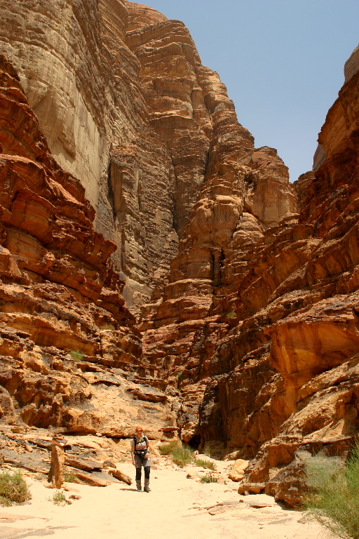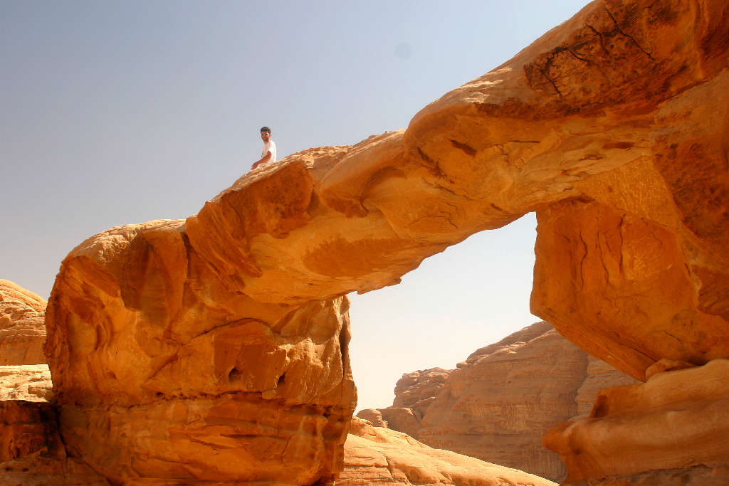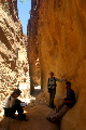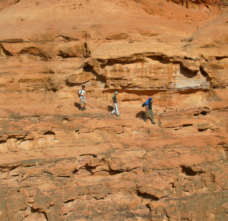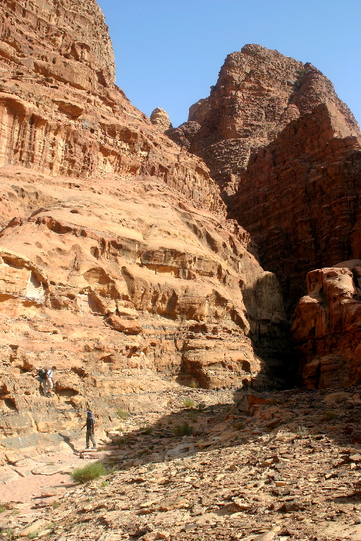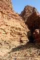 This turned out to be a brilliant idea, and the cost split between the four of us made it "fairly" reasonable. The guide took us into the desert and showed us the various rock bridges (Burhda Rock bridge in particular, was really stunning. Perched high up on the mountain, with a nice wide span). The rock engravings seemed bogus (to our untrained eyes), at least some of them were definitely fakes or recent, but the guide insisted they were all "real". On the way we stopped at "Lawrence's House", probably a misnomer, but nevertheless the spot commanded a very beautiful view of the entrance to various valleys and open desert on the other sides. If Lawrence really lived here he certainly picked a militarily strategic position. The "house" itself is just a crumbling wall in front of a rock formation. After 4 hours or so we were then dropped at the entrance (or exit) of the canyon, and the guide pointed in the general direction we had to take.