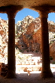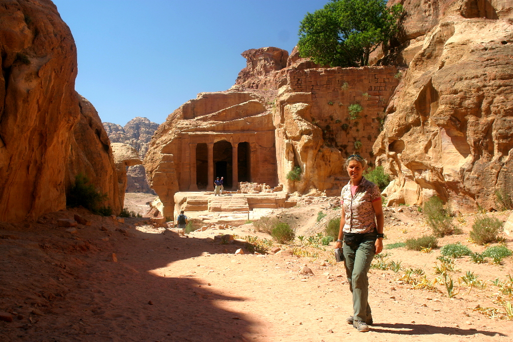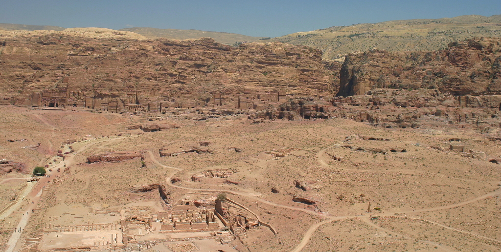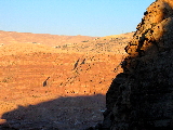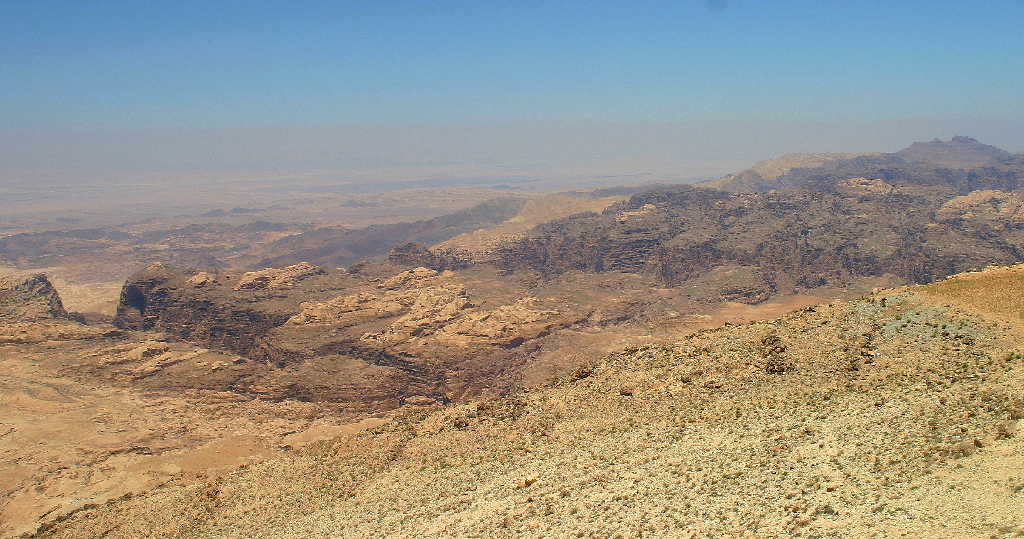 The second and third day in Petra were more of the same, but different. Lots more huge structures and tombs. On the second day we also spent a while finding another Geocache hidden above the police station in the middle of Petra proper. It was a lot of fun scrambling around the rocks and enjoying the view and the incredible architecture while looking for the cache. We found it eventually and spent the next 30 minutes just reading all the entries in the log and adding our own comment. Afterwards we headed to the Monastery on a mountain opposite of where we were. This turned out to be a huge, as in very large, building. The entrance is higher than a house. The plaza in front was all carved out of the mountain, incredible. Nearby we also enjoyed the view over towards Israel, 22km in the distance.