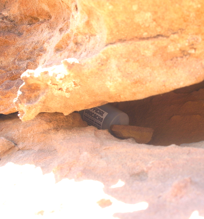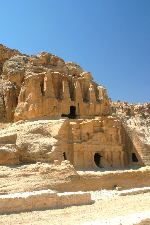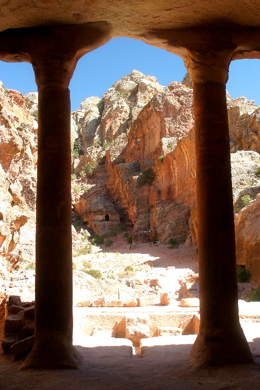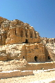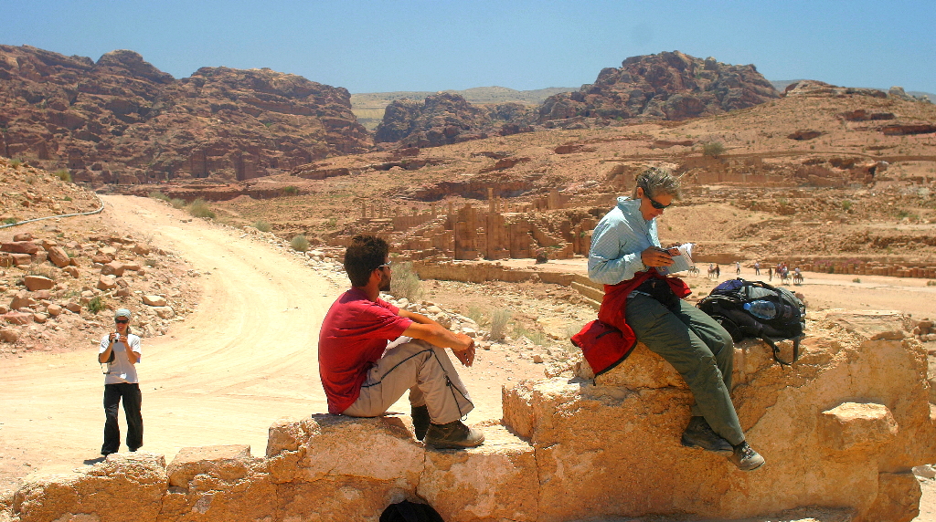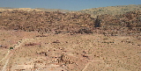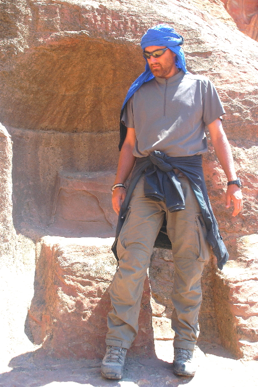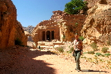 After spending some time in the plaza just watching the tourists and marveling at the Treasury we continued further down the valley to where it opened up into an open area between the rock formations. Here on both sides are huge "buildings" carved out of the rocks. These are actually tombs of varying shape and sizes, carved into the mountains on both sides of the canyon. We then took a sharp left and climbed up the mountain to the left of the Coliseum and headed up to the High Place of Sacrifice. Half way up we stopped and had lunch on a nice rock outcrops giving us a stunning view of the valley below as well as of the tourists making their way up, huffing and puffing, or often sitting on a donkey being guided up the mountain. Just below the top there is a snack bar across from the 2 obelisks, near these "obelisk" my GPS reported that there was a Geocache, so we explained to Manuela and Francesco what that was, and all set off to try and find it. We did find it in the end, a brand new micro-cache, with no entries in the log. We made our entry and hid it back where we found it and continued up to the High Place of Sacrifice. Here there is a great view over the whole area. There is an altar and some niches here where apparently sacrifices were made (of what no-one is really sure). We had a good look around before walking down the mountain on the other side.