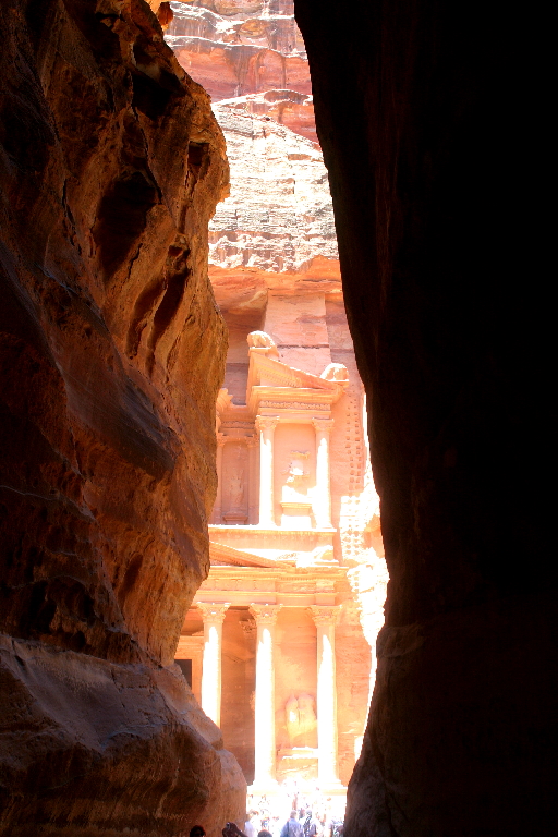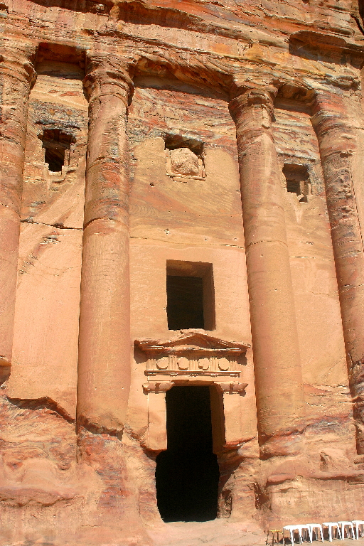 The next morning we made our way to the entrance to Petra in Wadi Musa. We got a three day pass and started to go in. First you are besieged by "Guides", horse riders offering a ride down to the entrance to the city gates (they can't go further) 200m further down, or horse / donkey carriages who can take you all the way into Petra (~1.4km in). Once into the city entrance, you have to watch out that they don't run into you as some go pretty fast through there with their carriages. At the city entrance proper, the road goes into a "ravine" which you then follow until you emerge at the plaza in front of the Treasury. The whole walk is surreal, they have carved a water channel along a wall, as well as niches, and even the remains of some figures (camels, a person leading camels), and when you look up you have sheer walls on either side, or you go through overhangs making it look like a tunnel in some places. Very impressive, and I didn't even mention the color, and coloration of the various rock strata. Depending on time of day and position of sun, it ranges from, light brown, to deep red or light pink. The first glimpse of the treasury is through nearly touching canyon walls. Hollywood couldn't have designed something like this. In the plaza itself there were quite a few people milling about and the usual touts selling jewelry and drinks etc., as well as touting, camel and donkey rides to the city proper (another 600m down). The Treasury itself isn't much inside, a huge room carved out of the mountain, but what I really found fascinating is the details on the columns and the entrance itself with the pillars. Additionally there are a couple of smallish side rooms, again everything carved out of the mountain.