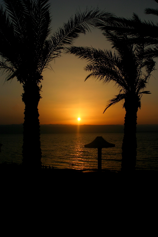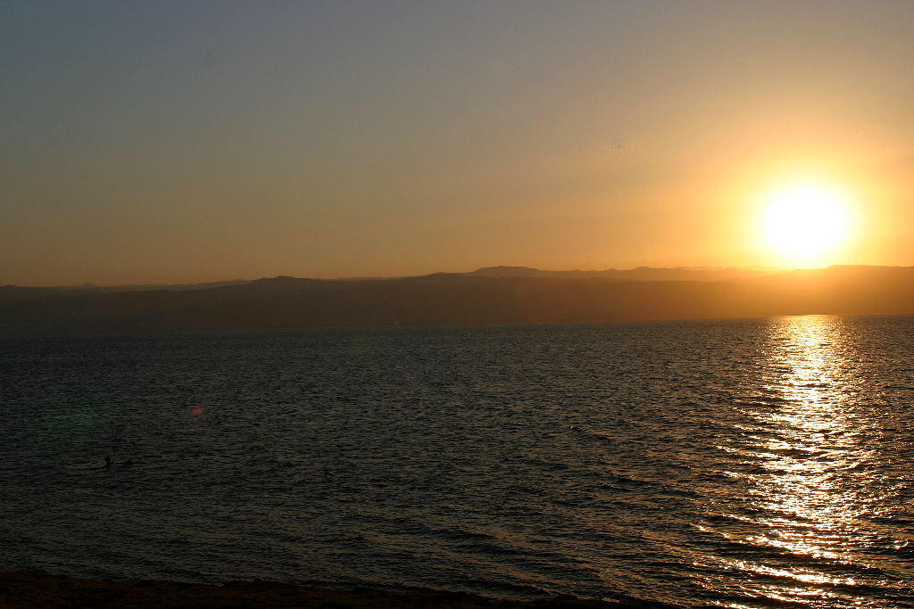 We decided to skip the Dana nature reserve, which is another tourist draw in Jordan. As we neared the Dead Sea, from the southern end, we were immediately aware of an increased security presence. We were stopped 4 times by military checkpoints, between going down to the Dead Sea and the northern shore where the beach lay. This was the first time since Egypt that anyone was so interested in our Passports and where we were going; and I was just starting to get used to not being checked every 10km anymore! The first thing one (well, I) notices about the dead sea is that it is, well, dead. There are no boats on it, no fish in the shallows, there is nothing growing along the banks, no waves either for that matter. At the northern end there are the hotels, and beaches, further south there is nothing (besides military checkpoints). We set up camp, after waiting 2 hours for the previous occupants of our chosen spot to vacate it. And enjoyed a wonderful sundown over the hills of Jerusalem in the distance. The following day we started the day early by a nice float in the Dead Sea. The salt level in the Dead Sea is so high that you literally float, you can't sink. This makes swimming pretty difficult, getting your feet down a maneuver in it self. Floating in a certain position you will suddenly spin around. Lots of fun. The rest of our time here alternated between laying in the shade reading, floating in the sea, and just plain relaxing. Later in the afternoon our Swiss friends showed up from Amman, they had managed to take care of what they need to do and decided to come down and say hello.