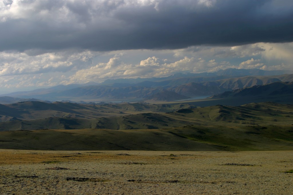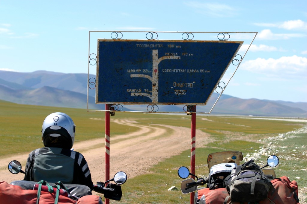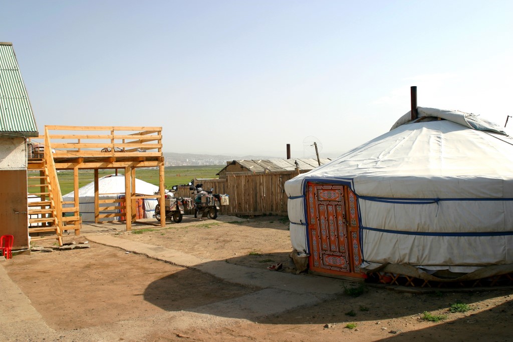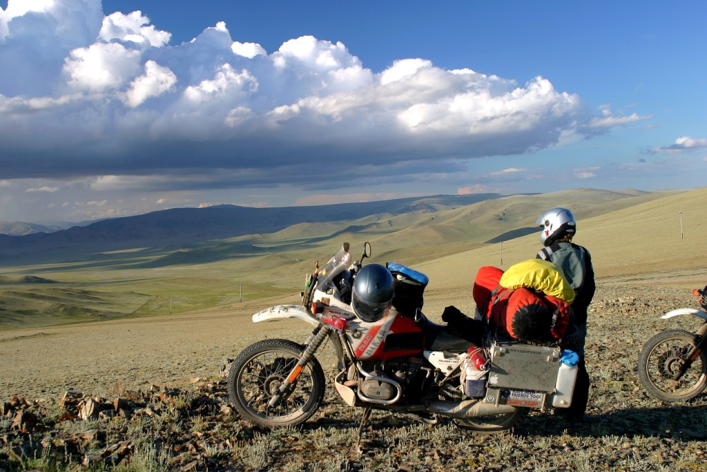 After the stress of getting out of Russia, entering Mongolia was a breeze, a total of 30 minutes and we were free to ride into the country. This is the way it should be. For the overview, check out Formalities: Mongolia Mongolia did not disappoint. We had seen pictures, and they did not compare favorably. The vistas are huge, no roads, no signs, people so friendly it was scary. For example, we stopped a few kilometers inside Mongolia to put our papers away and get a drink, and a local bus (4x4 Russian van) stopped. Everyone got out, everyone shook our hands and welcomed us to Mongolia, thrusting babies in our arms!! The Mongolians like to look at everything with their hands, and this took a while to get used to. Everyone is always alternatively smiling and shaking their heads at these huge bikes and riders. Lovely. Similar episodes would punctuate our whole stay in Mongolia. I have to say Mongolia is primarily a visual experience. For people used to cities and confined spaces I recommend they stay home. If Mongolia is anything, it is a huge open spaces, punctuated here and there with small villages and occasional GER camps (Ger's are the Mongolian traditional tents, called Yurts in other places). There are no signs, and no real roads anywhere outside the major agglomerations (of which there are only a few). So one basically just strikes out in the particular directions one wishes and if this track eventually goes over a pass it will converge with others as there is often only one that goes over the passes. On the other side, the paths will again diverge as everyone chooses a different way of crossing the wide plains separating the various mountains or hills. This goes on for thousands of kilometers! It took us 8 days to get from the border to Ulaan Bataar the capital. In this time the frame broke on Cecilia's bike twice, along with further breaks to the luggage racks of both bikes. All minor repairs by my standard. In the next settlement we would seek out a welder and he would then repair the broken part, the cost usually around 4-5$, and we would continue on our way. The route we choose to take to Ulaan Bataar is known as the southern route, and is basically long, flat, and empty. There are no trees only huge valleys, and plains, plenty of sheep, some camels, and horses (by the way we are at around 2000 meters for much of this part of the country). The track is lots of sand, corrugation, dust, and rocks, broken up by a few water crossings, and an occasional low pass or two. Day in day out, alway the same. Sounds boring, but it was really beautiful. One of the things I disliked the most, was that I couldn't spend a lot of time enjoying the scenery while riding, because the road demanded all your concentration. One of the strangest things we came across was a 100 km or so outside of Ulaan Bataar, as we came over a rise, we were greeted by the sight of hundreds of Gers and tents, usually next to piles of rubble. This across the major "path" which went across the valley. Everyone was digging for gold!! They just set up their Gers and started digging, and this for an area of one square kilometer. Really strange. We had to detour around all the activity and continued on our way. Ulaan Bataar was a very surreal experience, after all the empty spaces. It is a large city, with the accompanying traffic, noise and people. We had come here because we required a visa to re-enter Kazakhstan on our way south, the visa for Russia was multi-entry so that wasn't a problem, but Kazakhstan multi-entry visa was too costly and difficult to obtain. So we choose to do it this way. We also had a contact for a place to stay in Ulaan Bataar, and we were also expecting a packet sent from Switzerland with spare parts to come to that address. We had a telephone number for our "contact", a certain Sabine, who runs a "biker guesthouse" in the capital. Well, as luck would have it, Cecilia's cell phone couldn't place calls here, so we tried by having a friendly bank teller call the number for us. The result was that the person on the other end said that Sabine was not there and would return in 10 days!! Unfortunately we didn't get to talk to the person on the other end, and the teller only said he didn't speak English anyway. We simply didn't get any further with her so we had to find another way. First we decided to check out some of the other guesthouses, all were full, or we couldn't find them. Then I bought a local SIM card for my mobile and we called the number again. The person really didn't speak very much English, but with a little effort we managed to confirm the address and we then had a taxi driver take us to the address in question. This is where the fun begins, first near the address, I called again and the