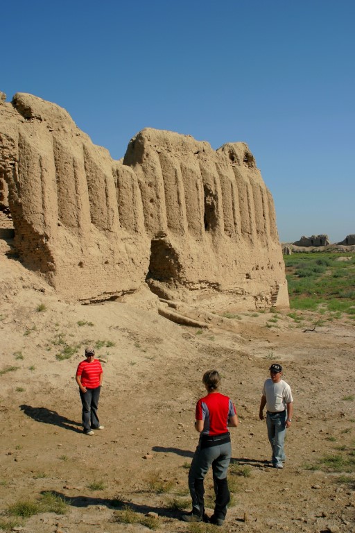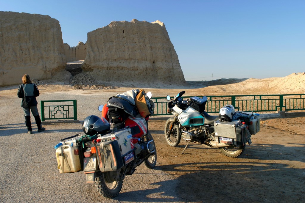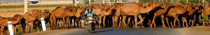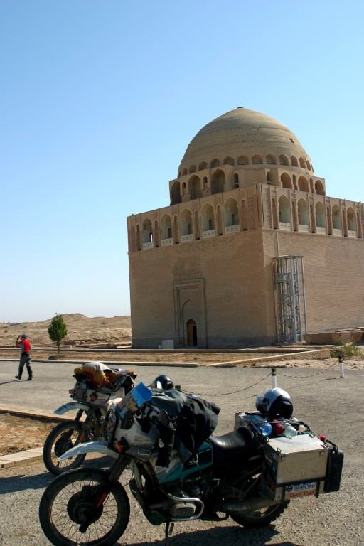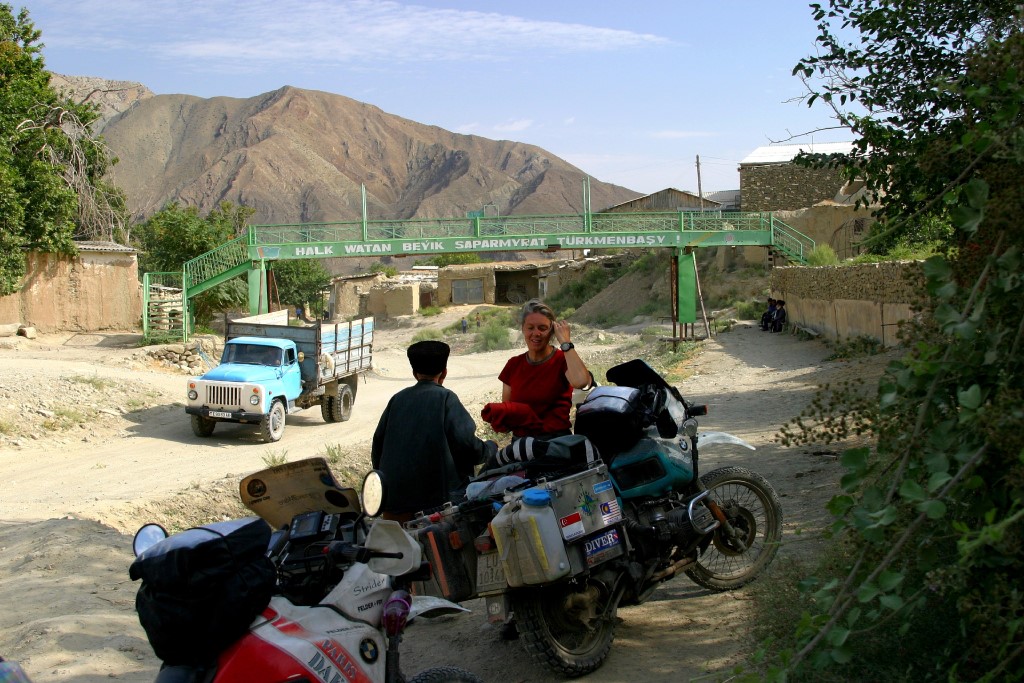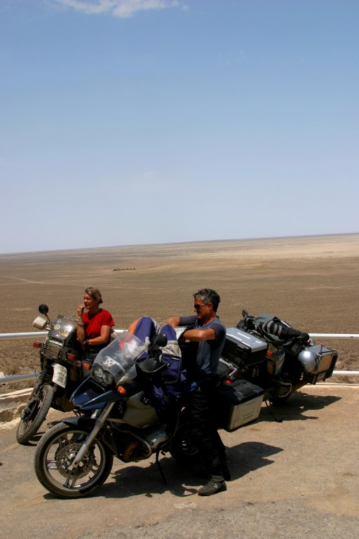 The trip across the Caspian was un-eventful. You could barely tell that the ferry was moving the water was totally flat. No wind or waves, so we slept very well indeed. We got up in the morning and we were still quite a way out, it would be after lunch time by the time we got there. All good things must come to an end and sure enough, eventually we docked and were asked to vacate our cabin, which we did. We were then told to wait upstairs after we got our bikes out of the way and packed, which we also did. In a while a lady comes on-board and we were told to go for a medical check! Ok, so we stand in front of the door while the only other passenger, a local Turkmen goes through the check and then it is our turn. I go first, she asks a couple of questions, where are we from, where have I traveled, and I get my temperature checked, that was it. The rest get the same questions, and she just copies my temperature on their charts and that was that. Next comes the immigration. They took all our passports, and in 30 minutes or so come back and say that Massimo and Matthew can go off the ship, we have to wait for the consul to come from Turkmenbashi, as we had no visas, and it would be issued here, but only the consul could do it. Ok, no problem, we settle in for a nice wait, while we watch our companions disembark.We wait. We wait some more, and some more. After more than an hour and a half, we are told to go to the immigration building, so we finally get to disembark. We ride the 100 meters to the parking lot and park our bikes next to Massimo's bike which is still here! Not a good sign. Once inside the building, we are told to first pay the "Entry fee", 12 dollars each, ok, no problem. I stand in front of this window, the lady takes the passports and writes out a receipt in triplicate and then duplicates the work for Cecilia's. We both sign our names on each of the three copies of our receipt, pay the $24.00 and go back to the immigration officer. As we were doing this our guide, Dima walks up and introduces himself. He has just finished with Matthew, who is now safely ensconced in the auto in the parking lot. He informs us, that the reason we had to wait so long was that the consul had car problems and another car had to be sent to town to pick him up! The immigration officer takes the receipt and our passports and starts filling out some form. When suddenly he stops and starts to talk to Dima about something, Dima turns to us and tells us that the printer is out of ink, and they have to send someone into town to pick up a new cartridge so we have to wait some more! Ok, no problem. In the meanwhile we do manage to get through customs, with Dima's help. He helps the officer fill out the customs form, and basically offers all the standard answers. We don't even have to show the bikes, or our luggage as Dima tells them that it is all affixed to the bike and can't be taken off. After about 40 minutes the cartridge is here, and the process can continue. Now we sign the form that they managed to print with the new cartridge. We are then told to go and pay $51 each for the visa, so back to the bank counter, and wait for the lady to write out a receipt in triplicate and of course twice. Not to mention that we ended up paying $106.00 (51x2=102, plus 2x2 handling charge!) By the way, that also explained the $24 entry fee, the fee is $10 and $2 for the bank charge. Dima also informed me that the exchange rate on the black market is around 23,000.00 manat to the dollar. The official rate, and the rate at which everything was being charge (the receipts were for manat converted from US dollars at the official rate) is 5200 manat to the dollar. Too bad we couldn't pay anything in the local currency!! It would have cost virtually nothing. Dima told me later that for a lot of their travels they can purchase air plane tickets for manat converted at the official rate making travel ridiculous cheap. (Subsidized by the government obviously). Ok, we were now past immigration. All in all not too bad. There was virtually no-one else there, as by now all the passengers leaving had been processed, and we were the only ones arriving. Next was the customs papers for the motorcycle. First though, Dima had to straighten out a problem with the visa. On the visa the areas to be visited had to be entered and apparently they had forgotten two places we were to visit, and it took Dima a half hour with the official and a number of phone calls to sort that out!! Back to the bikes. First, to an official who fills out an official route document. This document is used to calculate the road tax, insurance and various other miscellaneous charges (disinfections for example, which wasn't done but stamped as done on the document!, oh, and charged, $1). With this document we visit various officials which put their stamp on it and passed us on to the next post. After it had all the requisite stamps, we then had to pay said document, after a last stop at the insurance booth, where they also fill out an additional document as proof of insurance. We paid this (yes, another receipt filled out in triplicate, by hand, twice!). The cost was $182 for the two of us, so $91 each. The various charges added up to $89, and of course the $2 bank charge. For the overview, check out Formalities: Turkmenistan By the way, gasoline in Turkmenistan is $0.017 a liter, and the road tax is apparently intended to recover some of this subsidized fuel. In the end Massimo calculated that we paid a total of $0.25 a liter for the gas we used while covering the country, not bad. These calculations are based on the black market exchange rate of course!. We were then waved to the customs where they entered the bike data in a big book, then they sent me with another document to a different lady who put a stamp on it, no idea what that was. Then I was sent me to the police who also entered the motorcycle data in a book, put another stamp on another piece of paper, and wi