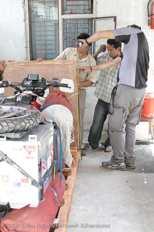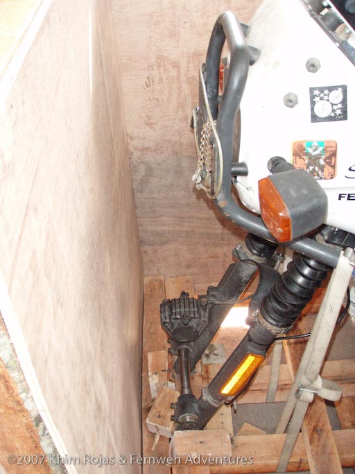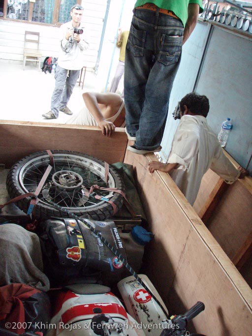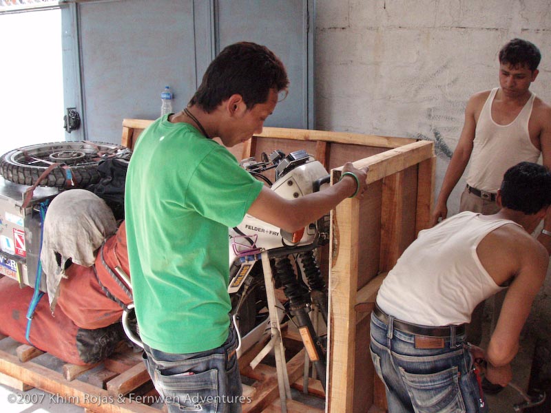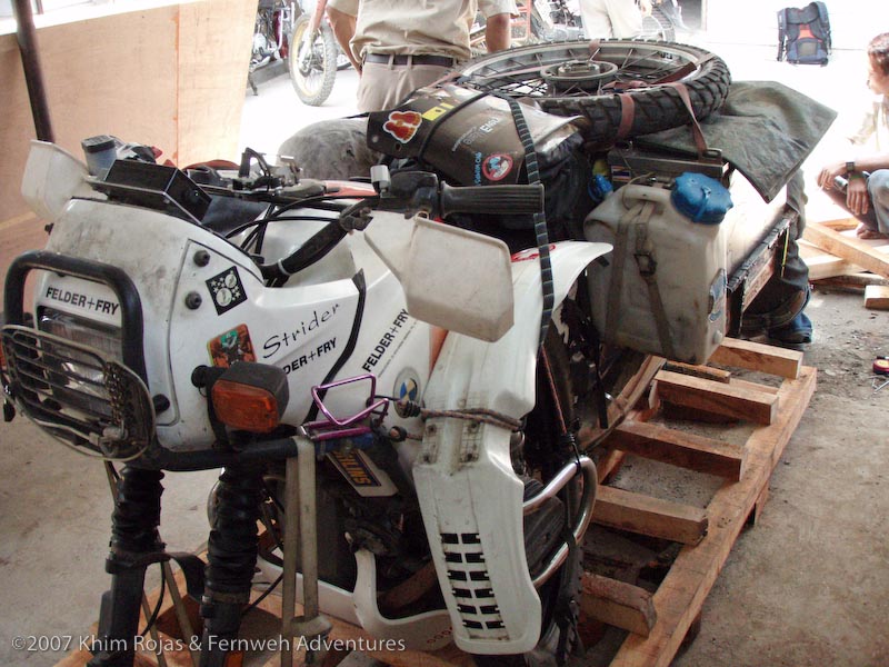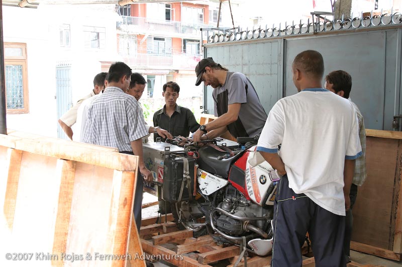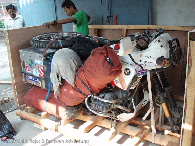 Overview Shipping a motorcycle from Kathmandu is pretty simple. There are probably over 100 shipping agents which will help you get rid of your money and get your vehicle to where you want to go. This being Kathmandu the general direction is Bangkok. I on the other hand wanted to get my bike shipped overland to India and from there by boat to South America. The reason for my decision to ship by boat rather than by plane was a financial one. A lot of people argue that the cost of waiting around for the bike to show up offsets this and in the end both are about the same price. I don't agree, and therefore did it this way. First step, find a reputable agent. Good luck!! I went around and spoke to a number of them in the Thamel area, I also did some research on the net. In the end my impression was that it was just luck of the draw. Some people would give one shipper high remarks, while two months later someone else would write something totally different, and no-one wrote about shipping by sea from Kathmandu. So in the end I went by gut instinct and chose the guy who had the nicest looking secretary. Who also happen to quote me a price which was in line with my expectations. The agent I chose, Sunrise Cargo in Thamel (sunrisecargo@wlink.com.np) had a nice office just up the road from the KGH (Kathmandu Guest house). Their main business is clothing manufacturing and exporting so they have experience with shipping freight (www.nepcloth.com). Mr. Bishwal Buddhi and his staff were very friendly and professional so in the end it was an easy choice. The name which shows up most often when shipping from Kathmandu is Eagle Eye Exports, I spoke to them but in the end they were both considerably more expensive and I simply didn't get a good impression. Procedure: Once everything was agreed on Mr. Buddhi sent his packer to my hotel to measure the bike so that he could purchase the wood. This was when the "problems" started. Measurements were taken, and I explained that the front wheel would be taken off and the whole bike compressed down with straps, and although they seemed to understand I wasn't all that sure. I also went to their place of business and we discussed the required materials. We made a few sketches and made some more measurements, in the end I felt I had made it clear what was required, so I had a pretty good feeling. The crating of the bike took place 4 days later. When they came to get me, they were carrying the panels pre built for crating the bike. Bad news, as I was sure they were not using my measurements, but rather their own. We drove to the warehouse/factory of Mr. Buddhi and there began to pack the bike (another plus, there was plenty of space to build/assemble the crate, and store the crate until the truck picked it up). Of course the measurements were incorrect, the result of which was that they had to take apart and rebuild a lot of their work. As they had no power tools they ended up having to do it by hand, and because of this the box ended up being around .5cbm larger than it should have been. In the end a pretty costly issue. I did manage to get it a lot closer that it would have been if they had just assembled what they had brought. But at this stage that was all that I managed. My previous effort to insure they used my measurements and not their own having failed. In addition, the wood they brought and with which they had pre-built the crate was pretty badly curved, and some of the boards were cracked. Nevertheless we proceeded and around 6 hours later it was done. On the 21 of May, once the bike was crated, I handed the Carnet De Passage (motorcycle bond/customs document) to Mr. Buddhi and this together with copies of my passport and vehicle papers, as well as a short packing list, and a paper giving him permission to export the bike in my name, was all that was required. The bike was put on a truck the following day and sent to the border. The bike landed in the port of Kolkata without any further delay. There it waited for a full container before the bill of lading could be filled out and returned. I decided to wait in Kathmandu until I had all the required paperwork, and was sure that the bike was on its way. This is of course not necessary as the paperwork could be sent anywhere the receiver is. But I wanted to make sure there weren't any surprises, and I figured it would be cheaper to stay in Nepal as long as possible rather than spend the time waiting elsewhere. The Carnet de Passage was brought back by the truck and I received it approx. 3 weeks after I gave up the bike (the carnet was stamped out on the 6th of June!). On the 19th of June I received the rest of the documents, the most important being the Bill of Lading without which I could not pick up the bike, and various receipts of payment. The ship, Pacific Envoy, left Kolkata for Singapore on the 17th of June. The shipment would be trans-shipped to the Kota Kaya, which would leave on the 30th of June for Santos, Brazil, where it was scheduled to arrive on the 22nd of July. So, so far so good. Now I could finally start getting ready to leave. Receiving: Kota Kaya (the ship bringing my bike..) Overview: A number of people had told me that getting the bike into Brazil was going to be complicated. Full of bureaucracy and delays. But I found that the people were all very friendly, and professional. And although they had no previous experience with this process, they did their best to make it as quick and painless as possible. So my impression is extremely positive. Once the receiving agent has cleared the paperwork, the customs can start theirs. Even if the ship is not in port yet, so it helps to get there early. Once the ship docs there is a 2-3 day delay while the partial container is processed. All in all, it will take around 10 days average to get your goods once the ship has unloaded.Procedure: First I contacted the receiving agent, and after getting the proper contact, went to Santos to meet him and fin