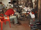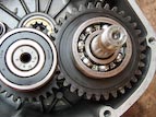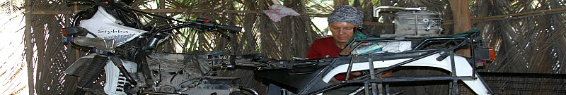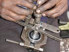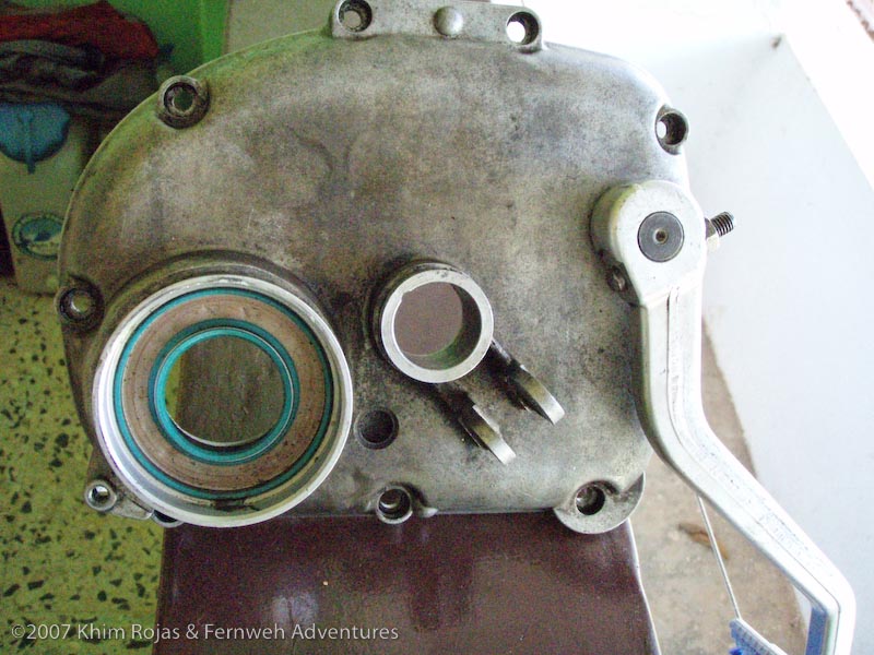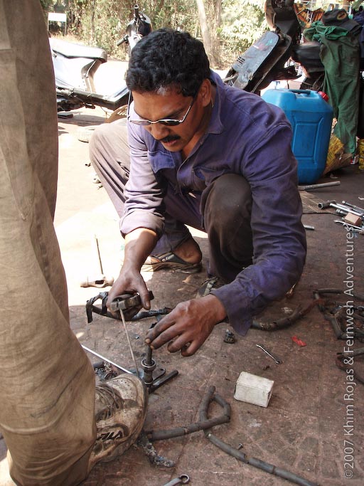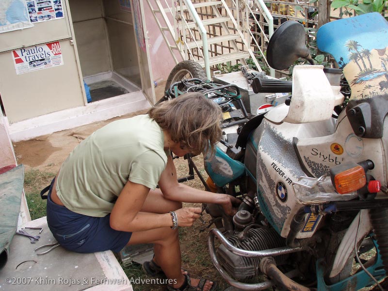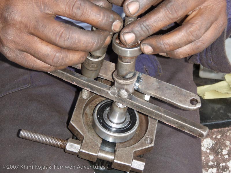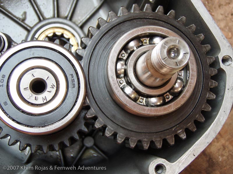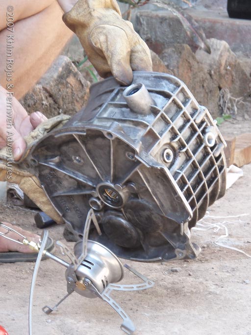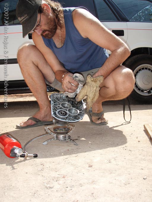 After a harrowing ride I made it to Hampi. Cecilia had called two days earlier to tell me that she was having technical problems with the bike. Well, after trying to diagnose the problem per SMS and telephone, it was decided that, in either case, it made sense to head over to where she was staying to have a look. First a few words about the ride. The best way to get anywhere in India is by getting an early start, and that is exactly what I did. The ride was really great at least up to the border to Karnataka, where the road took a major turn for the worse. Anyone who has been on this stretch of road will never forget it. Ankle deep red powder, broken up by huge rocks, and boulders. Of course for a change of pace, there are plenty of very deep potholes. All of this is actually quite tolerable if it wasn't for the constant heavy truck traffic, with heavy dump trucks, three abreast going in one direction and one coming in the other. Your visibility is down to 5 feet. The rest of the ride was the usual Indian experience. Crowded and confusing towns, suicidal drivers, and plenty of interesting vistas. Hampi is a fascinating place, not only the temples and ruins, but also the fact that it is a major tourist and pilgrim center. Check out the pics in the main picture area. Ok, back to the transmission story. In Hampi I test rode the bike to see if I could definitively figure out what the problem was. The vibration and noise pointed to the drive shaft. The vibration was erratic, and a clanking noise was coming from the general vicinity of the upper u-joint of the drive shaft. Ok, no problem, I have a spare drive shaft with me so this should be simple. I went and got myself a paper, while Cecilia dismantled the swingarm and took out the drive shaft. Well, it turned out that the drive shaft was fine. The final drive was also fine, something we ascertained by turning it manually without anything connected to it. Since both the u-joints on the drive shaft where fine and the final drive was fine, that left the transmission as the only possible culprit. So now we had to decide whether to do the work here or ship the bike back to Goa, or try and ride it back. After much debate and contemplating the various options, we decided to head back to Goa and do the work there. There were a number of reasons for this. Mainly, I already had all the resources I would need for something like this, checked out. Including a very good machine shop. Additionally, Hampi is a ways from the nearest town (Hospet) with any mechanics or infrastructure. So we had to put the bike back together anyway, and this being a BMW, the decision to ride the 350+ km wasn't all that hard. Another day was spent just sightseeing before heading off very early in the morning. This allowed us to get through most of the towns without major problems or traffic and a little over 6 1/2hours later we were back in Benaulim, Goa. The following day, Cecilia took the transmission out of the bike. The first problem with disassembling the transmission on a BMW is removing the output flange. That is the part that connects to the drive shaft and transfers the energy to the rear wheel. This part is held on by a large nut, which is very tight and requires a special tool to hold the drive shaft connector, while turning the nut. After that, the flange itself needs a puller to remove it from the shaft to which it is connected. So I took the whole transmission to the mechanic where I got the oil changed. He had a look at it, and pulled out a tool which is used to hold the clutch assembly on smaller bikes, and together with his assistant got the main nut off. He then took a straight puller he had, and welded a cross section on to it so that he could pull the flange off the output shaft. This took a while since the first two attempts didn't hold. The flange was too tight on the shaft, eventually he managed to weld it good enough that it held, and off came the flange. Now it was up to me. The first thing I had to do is heat the transmission casing to expand the metal so that the bearings at the end of the various shafts would come loose and I could open the transmission. This is normally done with a heat gun, but as you can see by the pictures a normal cooking stove also works fine. Once I got the cover off the rest is pretty simple. Unfortunately, after looking at all the bearings and shafts, I was not able to determine what the cause was. None of the bearings had any problems, the shafts and gears all looked ok. The only thing was the small output bearing which for some reason had come off in with the casing when I open the transmission (normally the bearing will stay on the shaft). I re-heated the casing and got the bearing out, and sure enough, it was bad. It seemed incredible that the vibrations and noise came from the fact that this bearing was going bad. (It now had at least 500km since the vibrations/noise had started, and still felt serviceable for the most part. I assume that when it finally does go, it would do so quickly). Although we made it this far, I would definitely not recommend riding any further, in fact, if I hadn't been too lazy to find a suitable place near Hampi, and there weren't two of us, I would not have undertaken to ride back to Goa before fixing the problem locally. With the help of our hosts, who telephoned around, we found a place in Margao who had the required bearing. So after a short trip into town we were back with a standard SKF 6304 bearing. This was too easy! In short order, I had the transmission back together again. I put it back together the same way I took it apart, and without checking the bearing clearances. (There are shims between the bearings and the case). So in a short space of time, I managed to make three major mistakes. Nevertheless, Cecilia put the transmission back in the bike, and although it was very, very tight (difficult to turn), assured her that it would be fine. It wasn't! A short test ride went well; fo